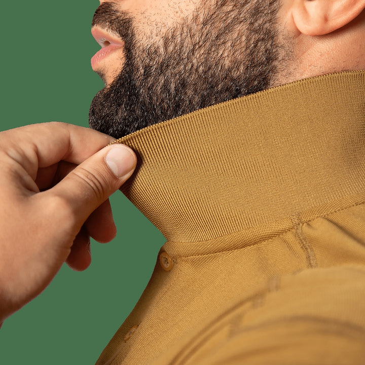 - Improved collar and cuffs made with CoolPass and elastane for better shape retention.