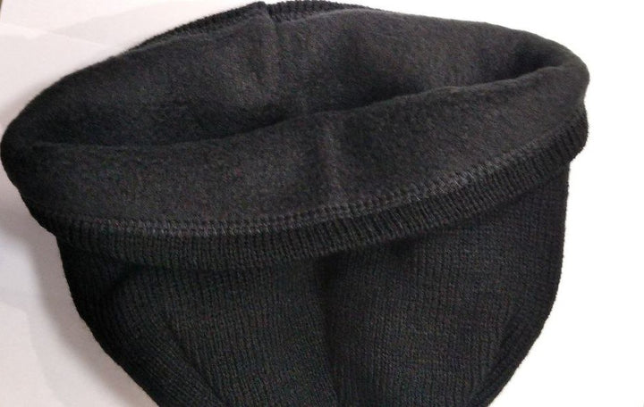 Stay warm and stylish this cold season with the knitted fleece beanie in black!