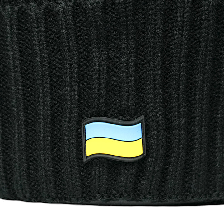 Black Fleece-Lined Knit Hat with Ukraine Flag