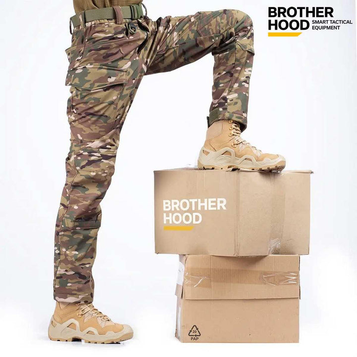 The Brotherhood UTP 2.0 SOFTSHELL Tactical Pants in Multicam are designed for both military personnel and outdoor enthusiasts, providing exceptional comfort and freedom of movement for active use in various conditions.