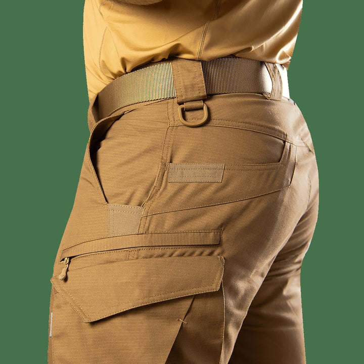 - Left thigh includes a cargo pocket and a hidden zippered pocket with dividers for secure phone storage during movement.