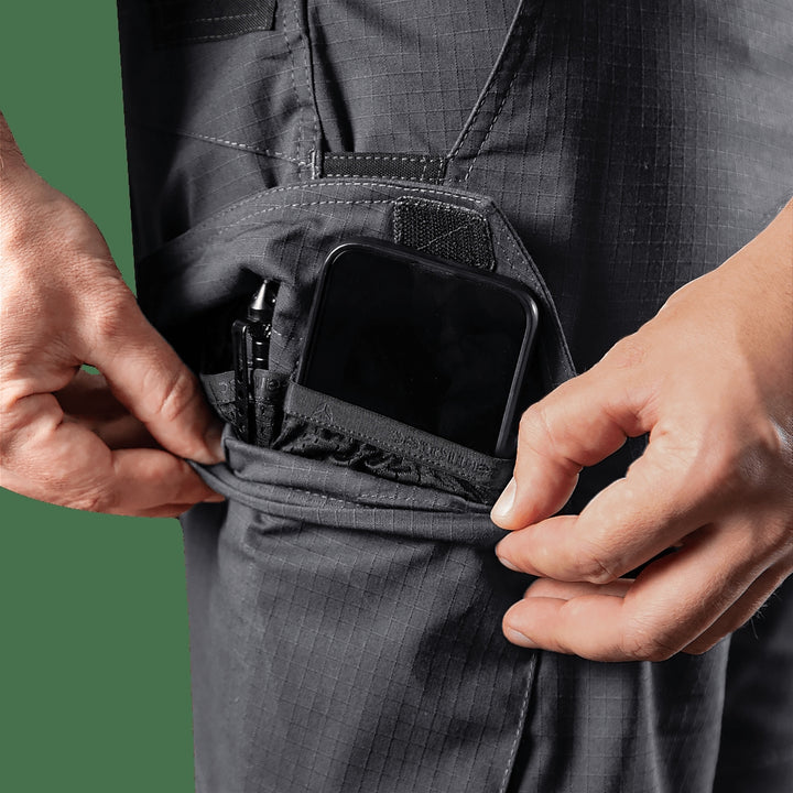 - Left thigh features two pockets: a large cargo pocket and a hidden zippered pocket with internal dividers, ideal for securely storing your phone during movement.
