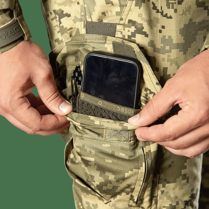 - Right cargo pocket features dividers for small items; left side has a hidden zippered pocket for secure phone storage.