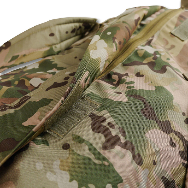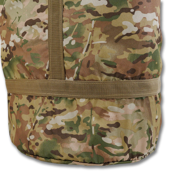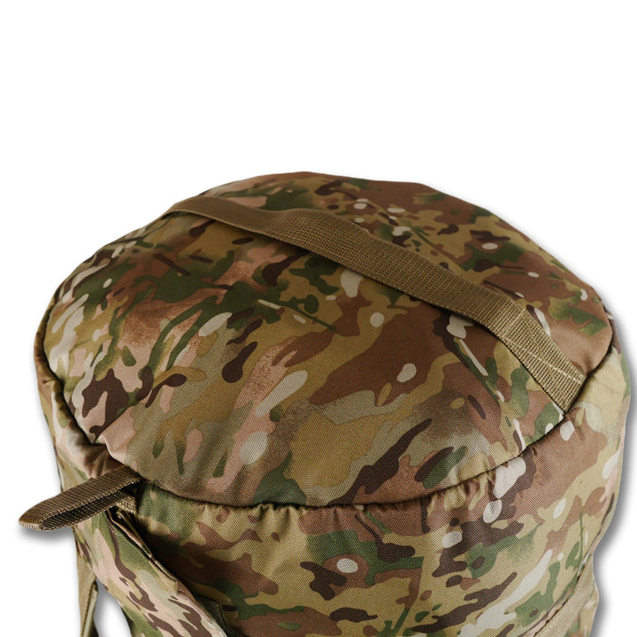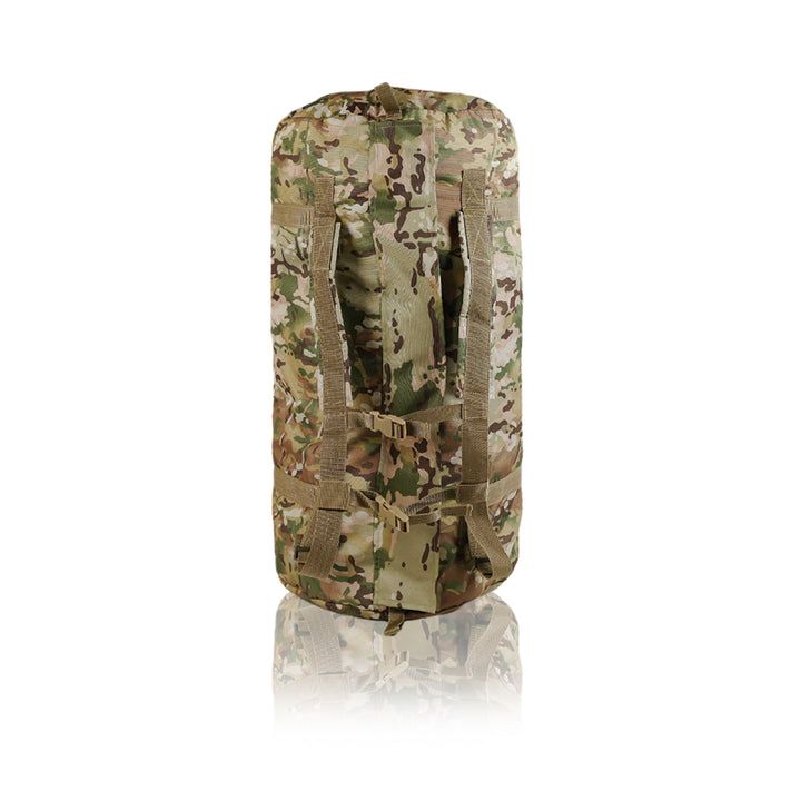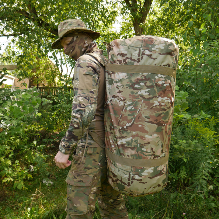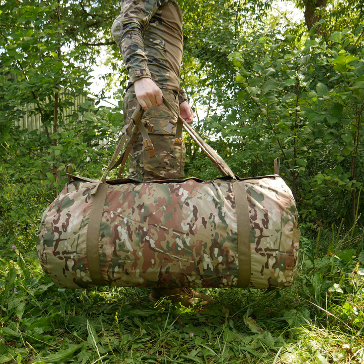 The Kiborg 120 duffel bag is designed for transporting personal belongings and gear, making it an essential companion for outdoor adventures and military use. Its cylindrical shape allows for easy packing of various items, including sleeping bags and personal gear.