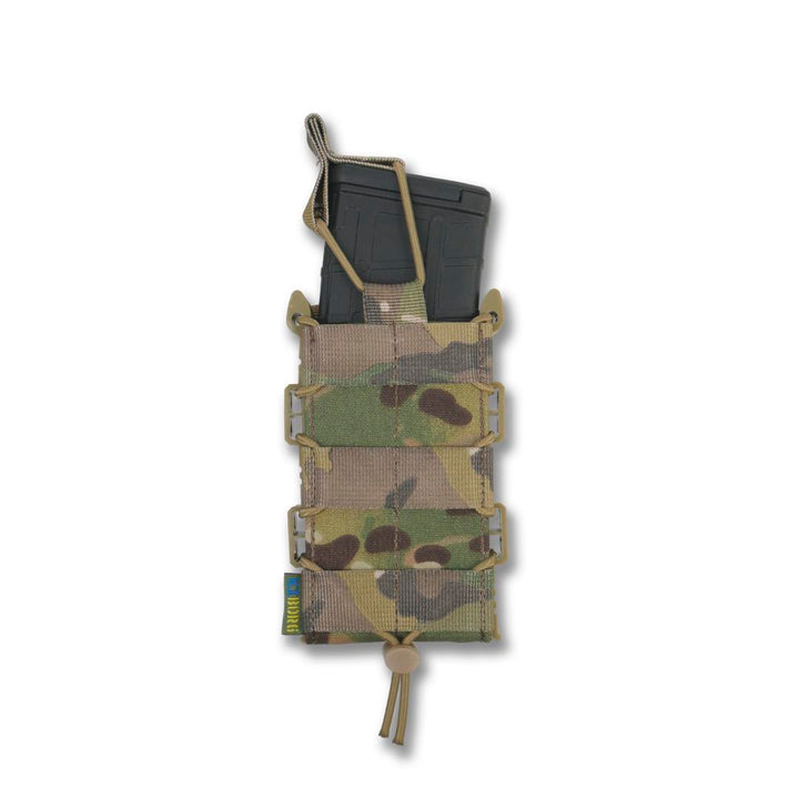 The KIBORG GU Single Mag Pouch is a robust and reinforced pouch designed to securely hold a single magazine, crafted from certified 1000D Cordura Nylon with an IRR coating that prevents visibility in low-light conditions. Its dual-layer construction and impact-resistant polymer frame ensure maximum durability and reliability.