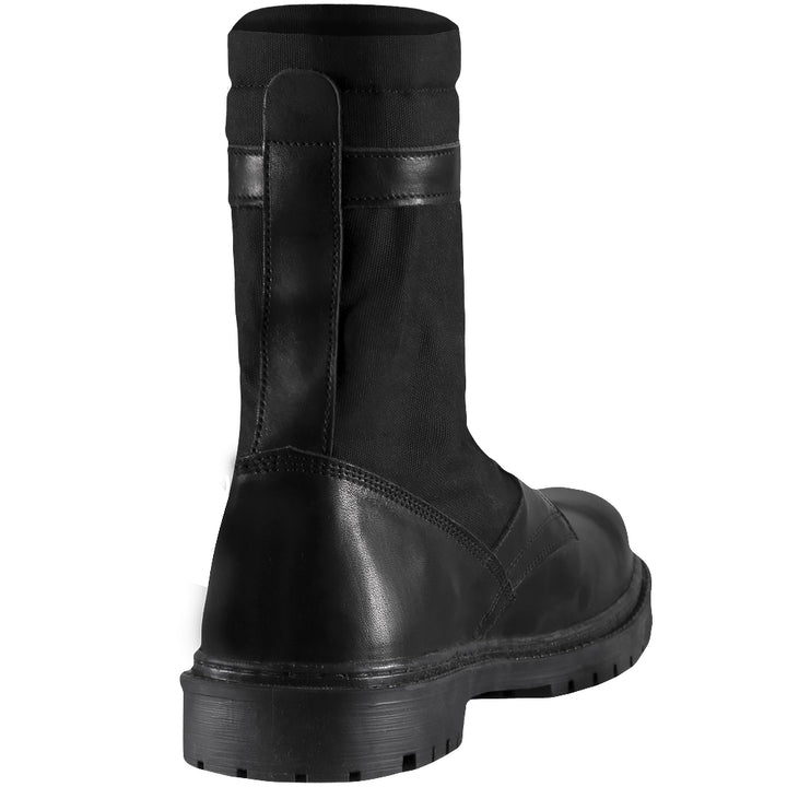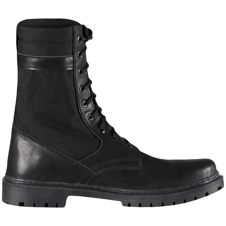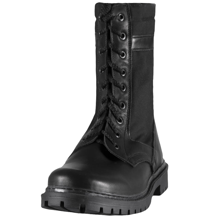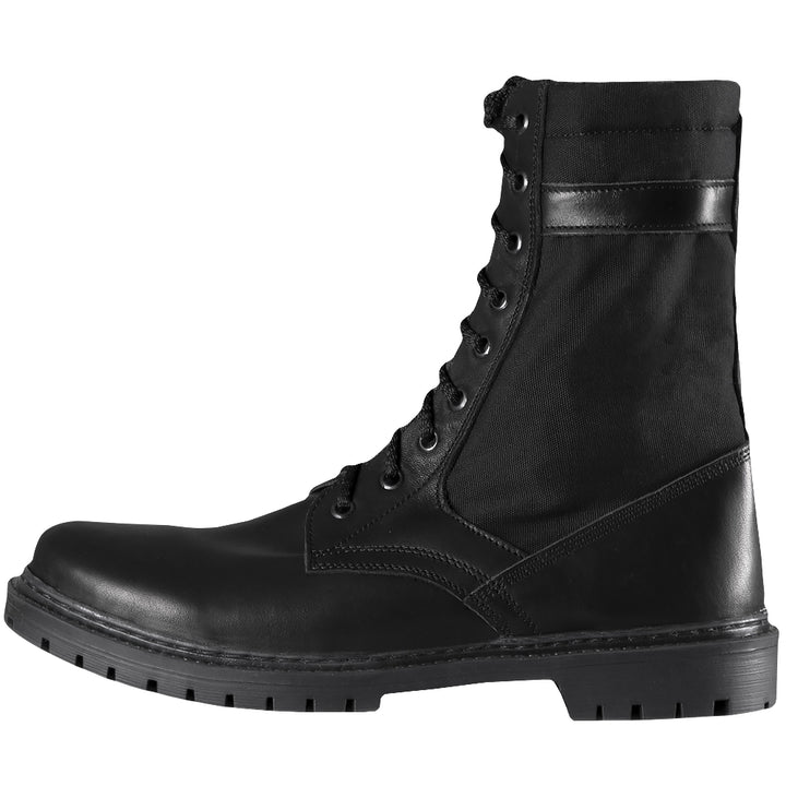 The Camotec Lightweight Black Boots (0377) are expertly designed footwear for military personnel, security professionals, and outdoor enthusiasts. These boots combine natural leather with canvas inserts to reduce weight and enhance ventilation, keeping your feet fresh and comfortable during extended wear.