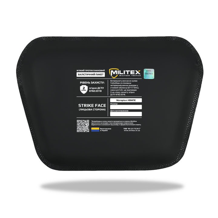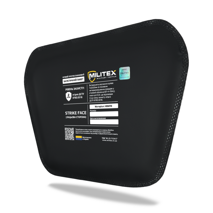 - Militex ballistic insert made from UHMWPE and synthetic non-woven material (Kevlar) withstands 7.62x25 mm steel-core bullet impacts (pistol cartridge 57-N-134s, TT pistol)