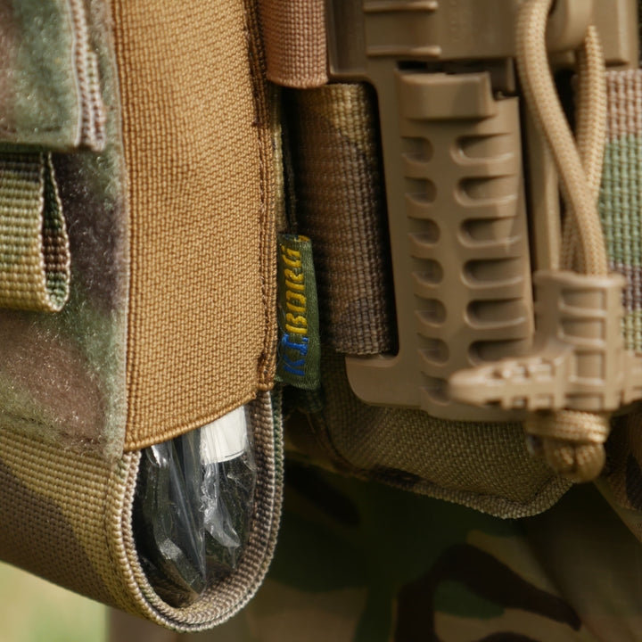 The open tourniquet pouch is designed for the **storage** and **quick access** to various types of tourniquets, featuring additional compartments for tactical scissors and a marker. Made from **durable nylon webbing**, it ensures long-lasting performance and resistance to wear.