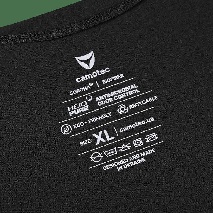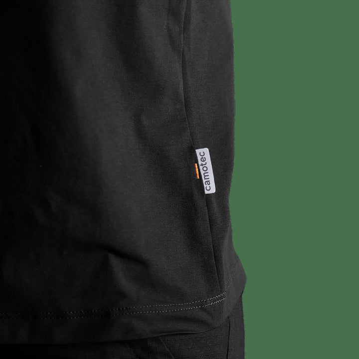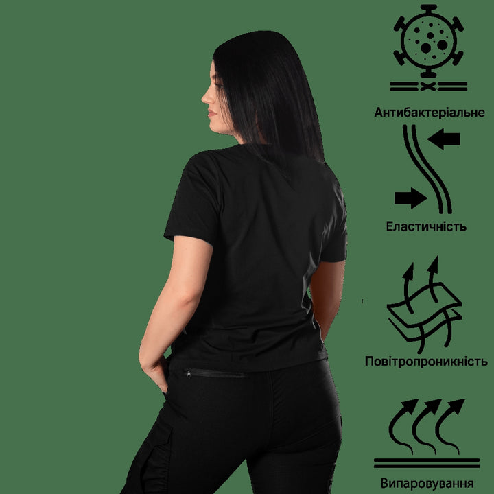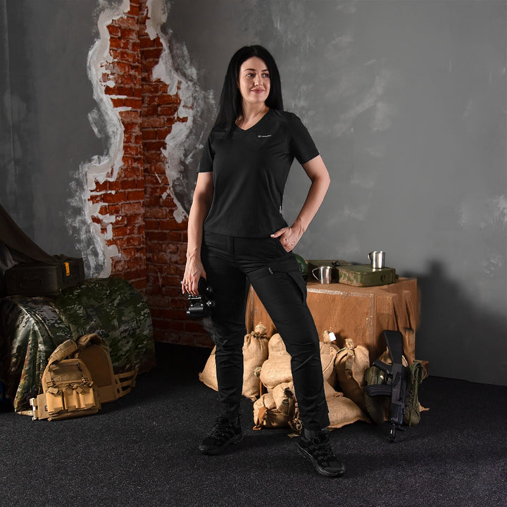 Introducing the Pani Totem Logo V-neck T-shirt in black, a stylish and functional piece from the brand camotec, designed for everyday wear, outdoor activities, sports, and field service. This T-shirt combines modern design tailored for women's anatomy with innovative materials that ensure comfort and durability.