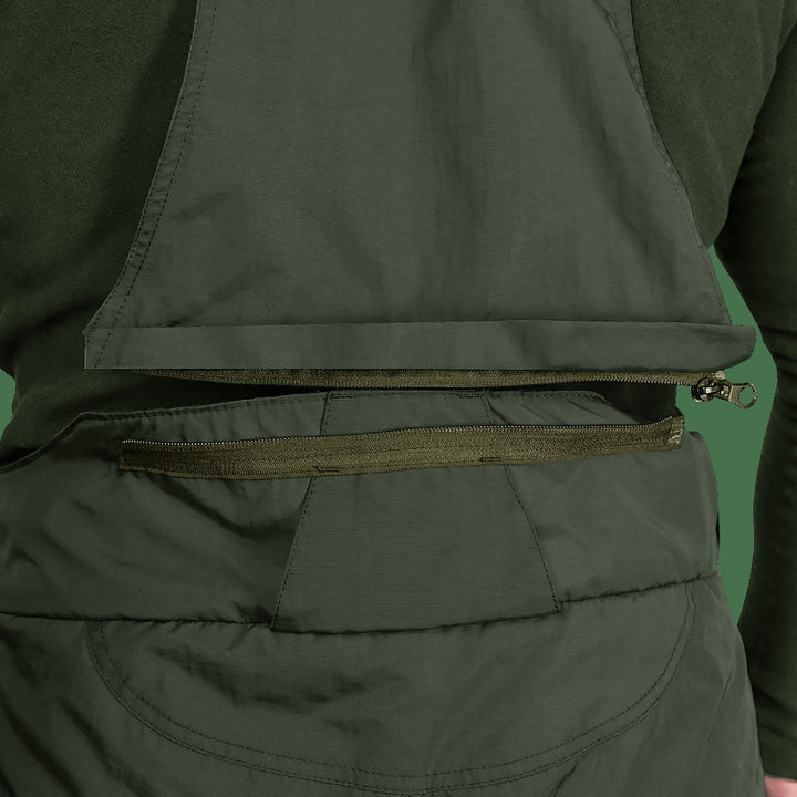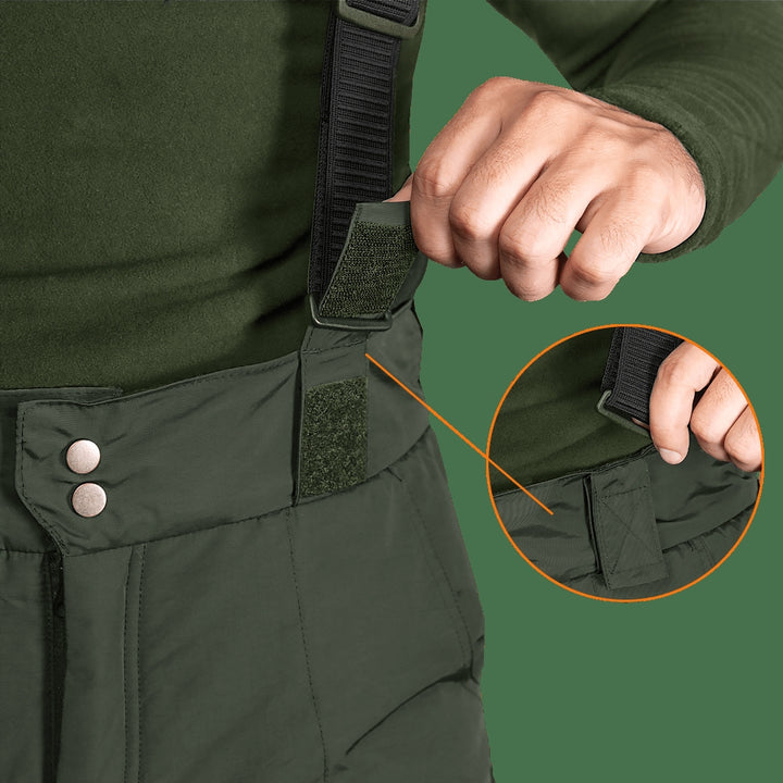 - Pants designed with ergonomic cut, insulated wide waistband for lower back protection, and adjustable leg openings with zippers.