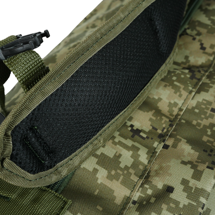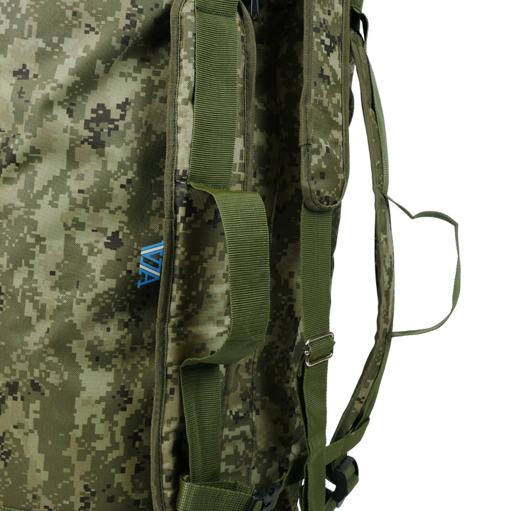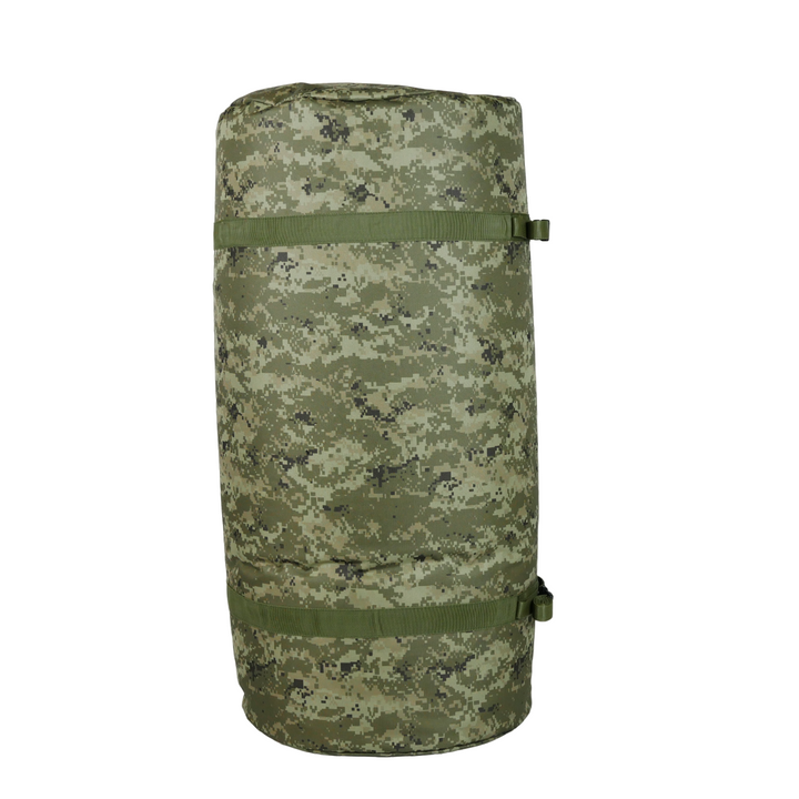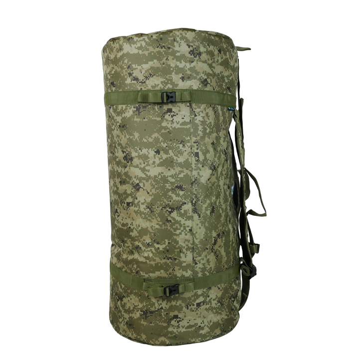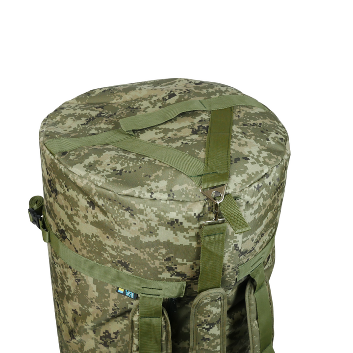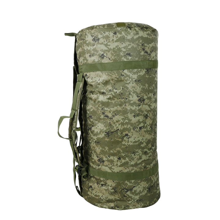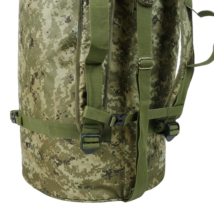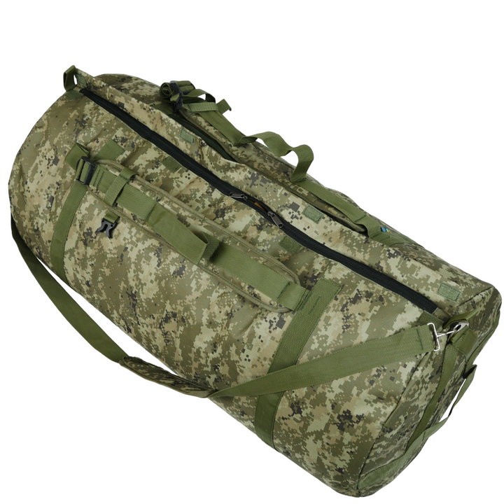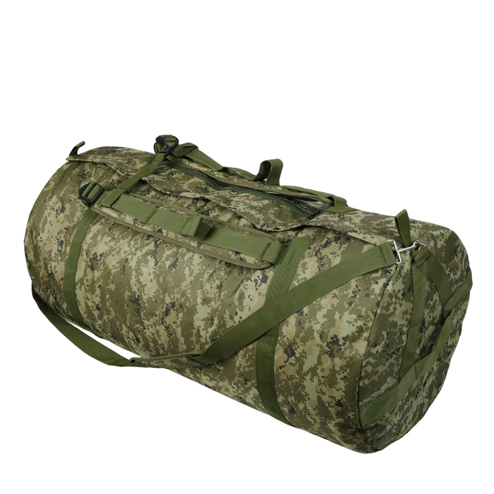 The duffel bag is designed for transporting large military or sports gear, made from high-quality reinforced threads and water-repellent fabric to withstand tough conditions. Its adjustable straps allow for comfortable carrying as a backpack without causing shoulder irritation.