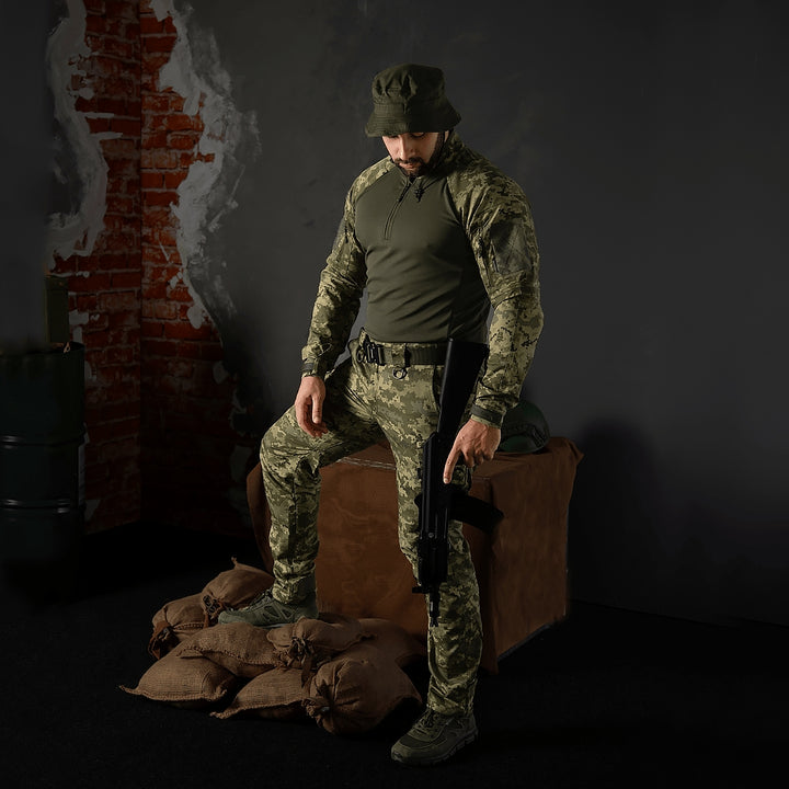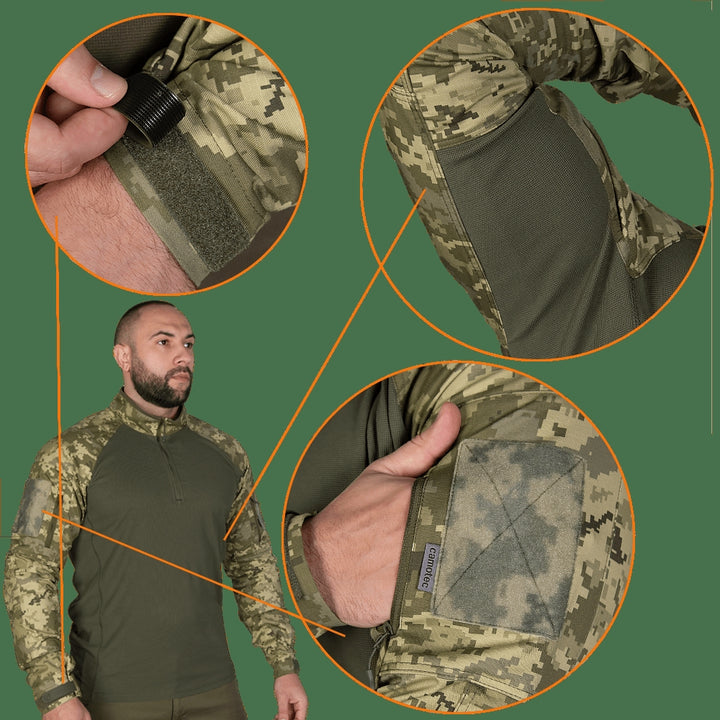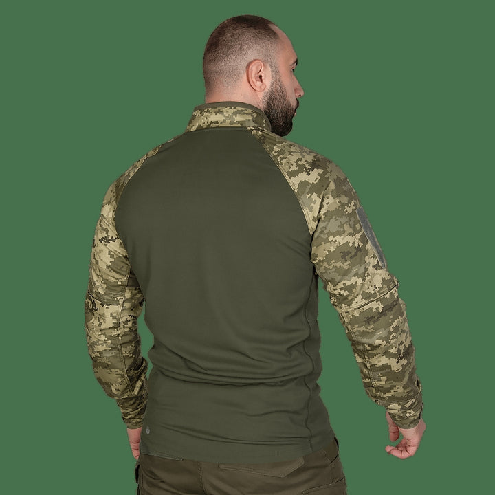 The Raid Combat Shirt in Pixel/Olive (7608) by Camotec is designed for optimal performance under body armor, making it ideal for military and paramilitary units during the spring and summer seasons. This tactical shirt combines protection and comfort essential for intense physical activity.