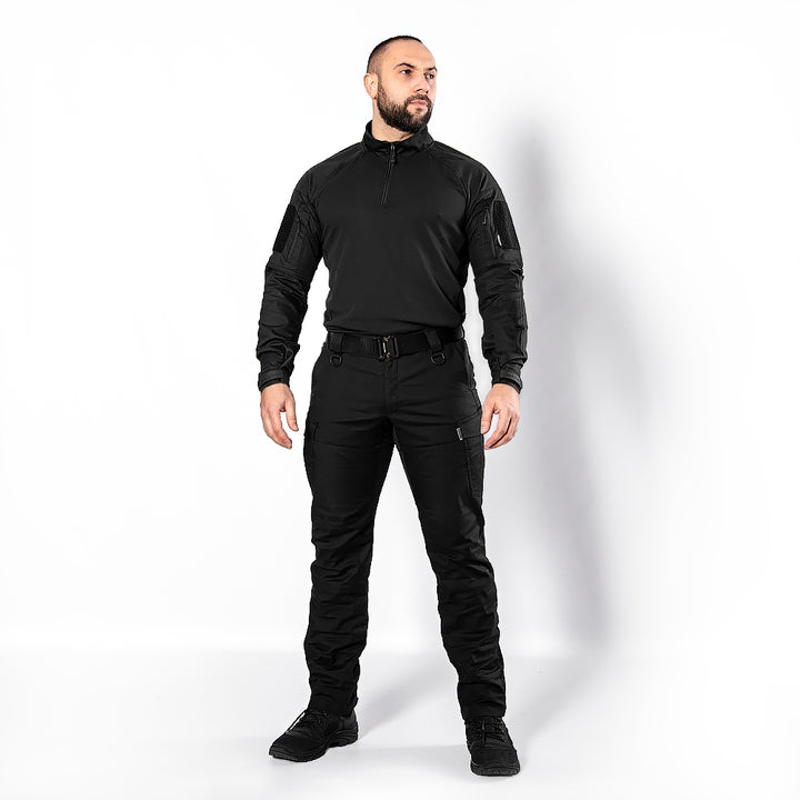 The Raid Twill/Sorona Combat Shirt in black (model 8950) from Camotec is designed for optimal comfort under body armor, making it ideal for military and tactical use during the spring and summer seasons. This tactical shirt is engineered for durability, breathability, and ergonomic fit, ensuring it meets the demands of active duty personnel.