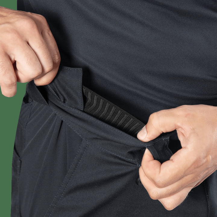 - Double-access thigh pockets for easy access in any position, including a secure zippered pocket for valuables.