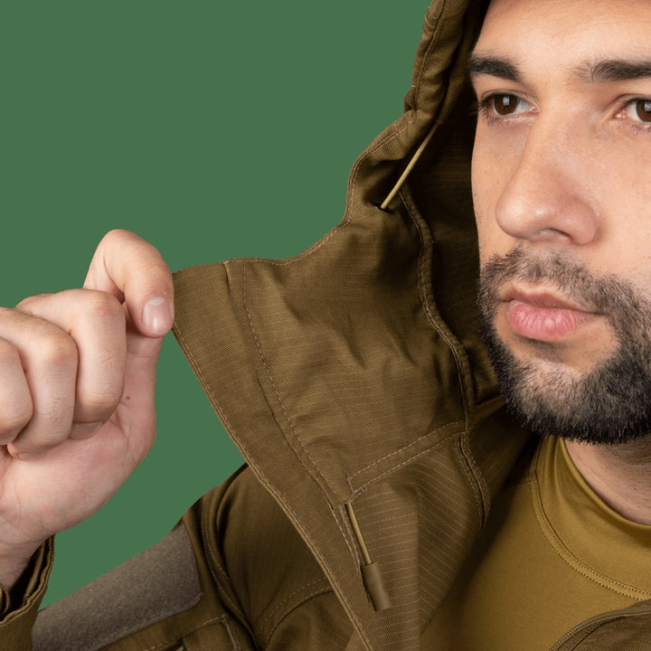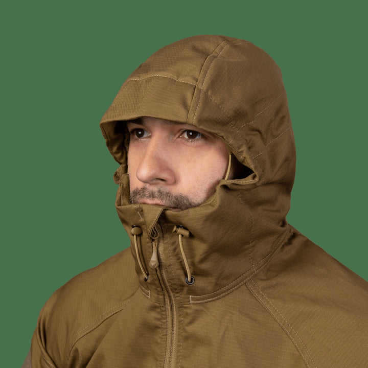 - Ergonomic jacket design with hood and high collar for chin protection