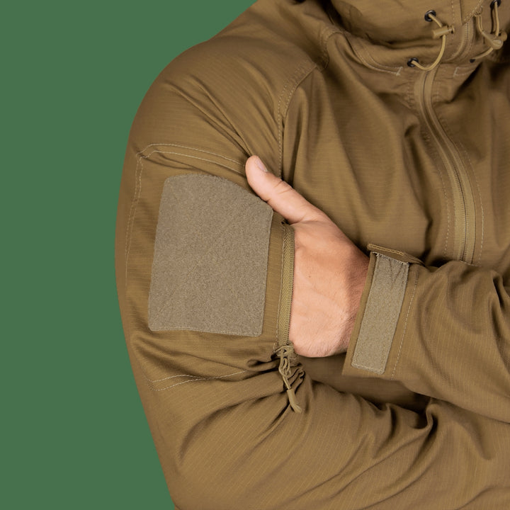 - Four spacious pockets: two front and two on sleeves with Velcro for patches