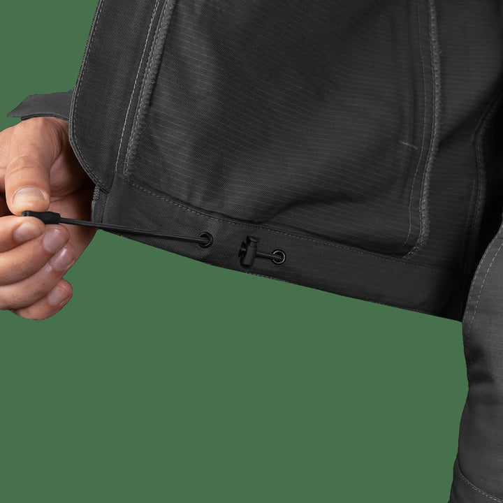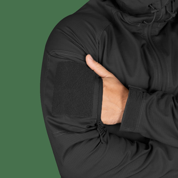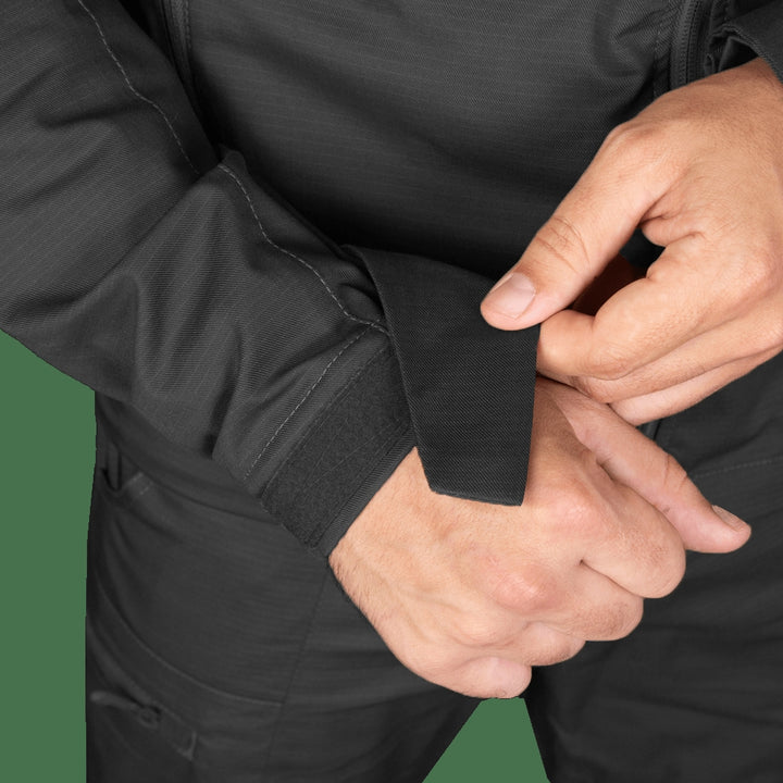 - Features a jacket with two spacious front pockets and two sleeve pockets with Velcro for patches.