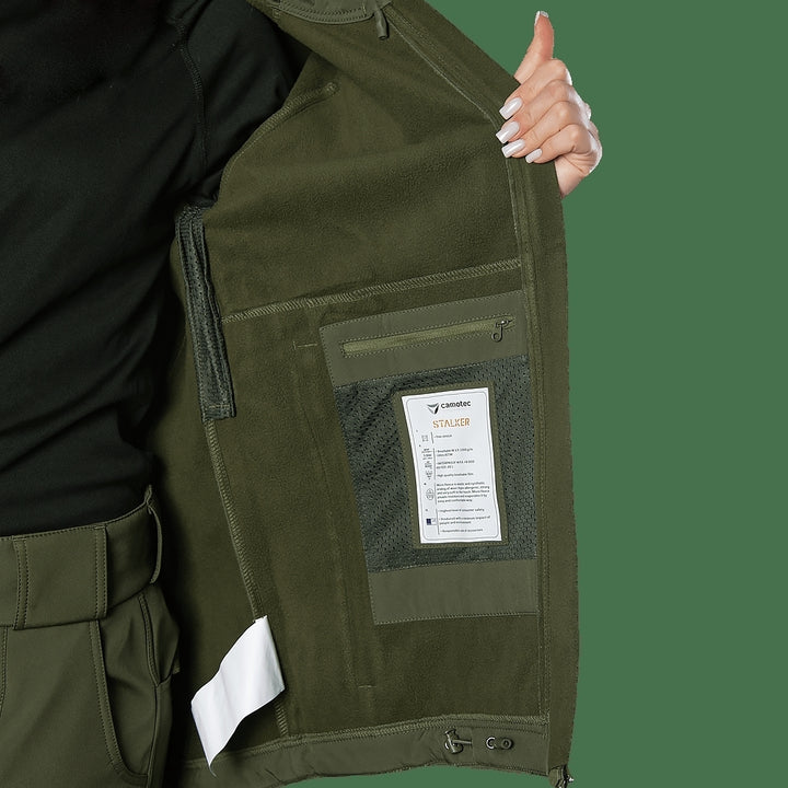 Introducing the Stalker SoftShell Jacket in Olive (7441) from camotec, a modern and functional jacket designed for urban use and uniform wear in militarized and security organizations. Made from high-quality SoftShell fabric, this jacket combines warmth, wind and moisture protection, and durability for various conditions.