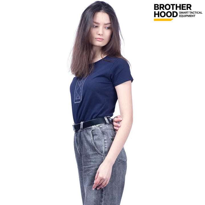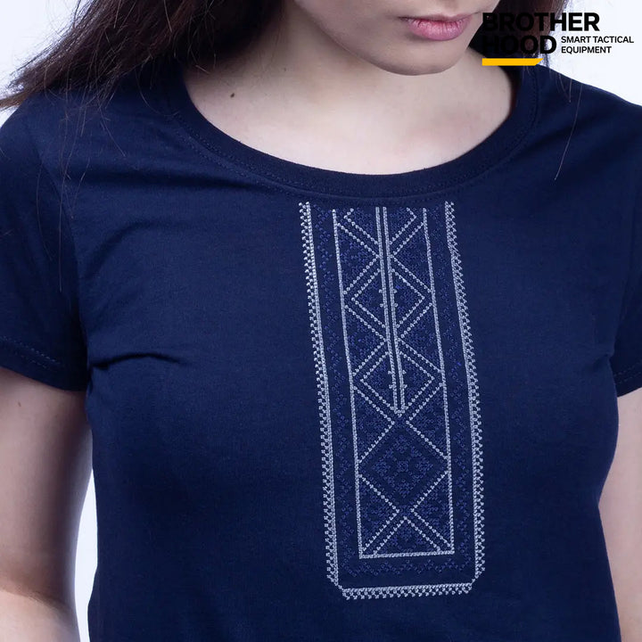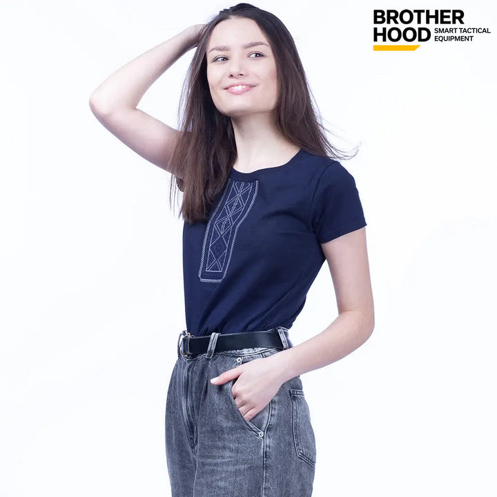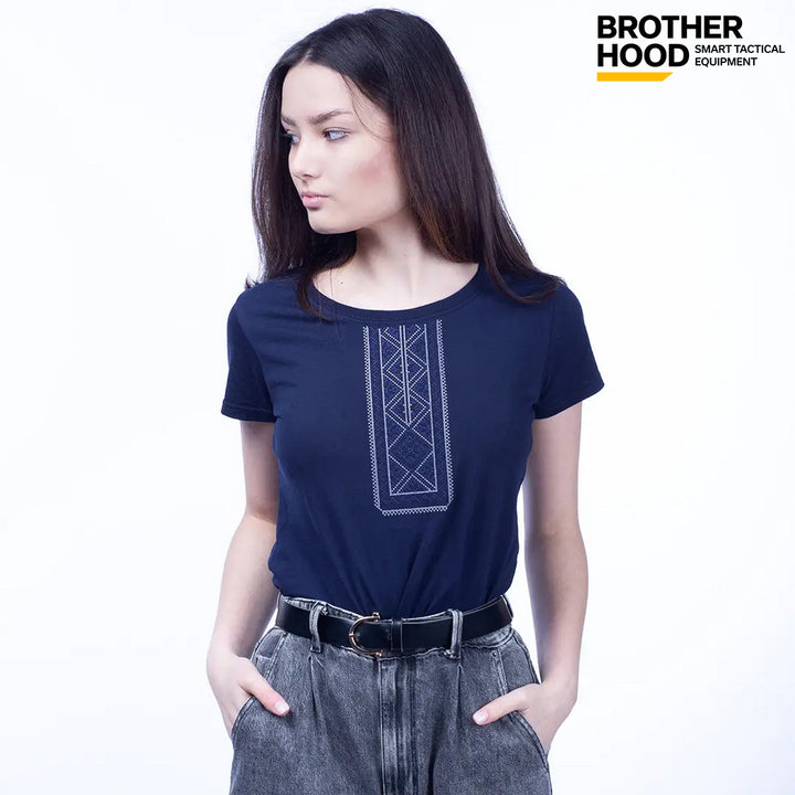 The Brotherhood F Women's Embroidered T-Shirt from Brother Hood is a stylish ethnic shirt that seamlessly blends traditional embroidery with a modern cut. This unique t-shirt enhances both festive outfits and casual styles, showcasing a proud Ukrainian patriotic spirit.
